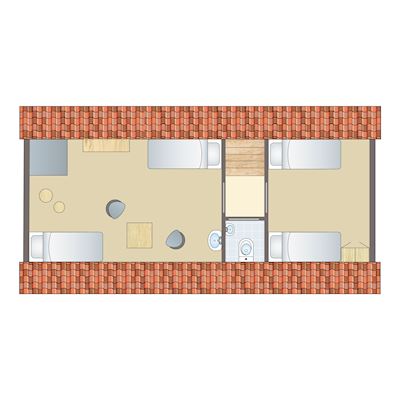 - Chambre à coucher avec deux lits boxspring pour 1 personne, surmatelas pour 2 personnes et lavabo