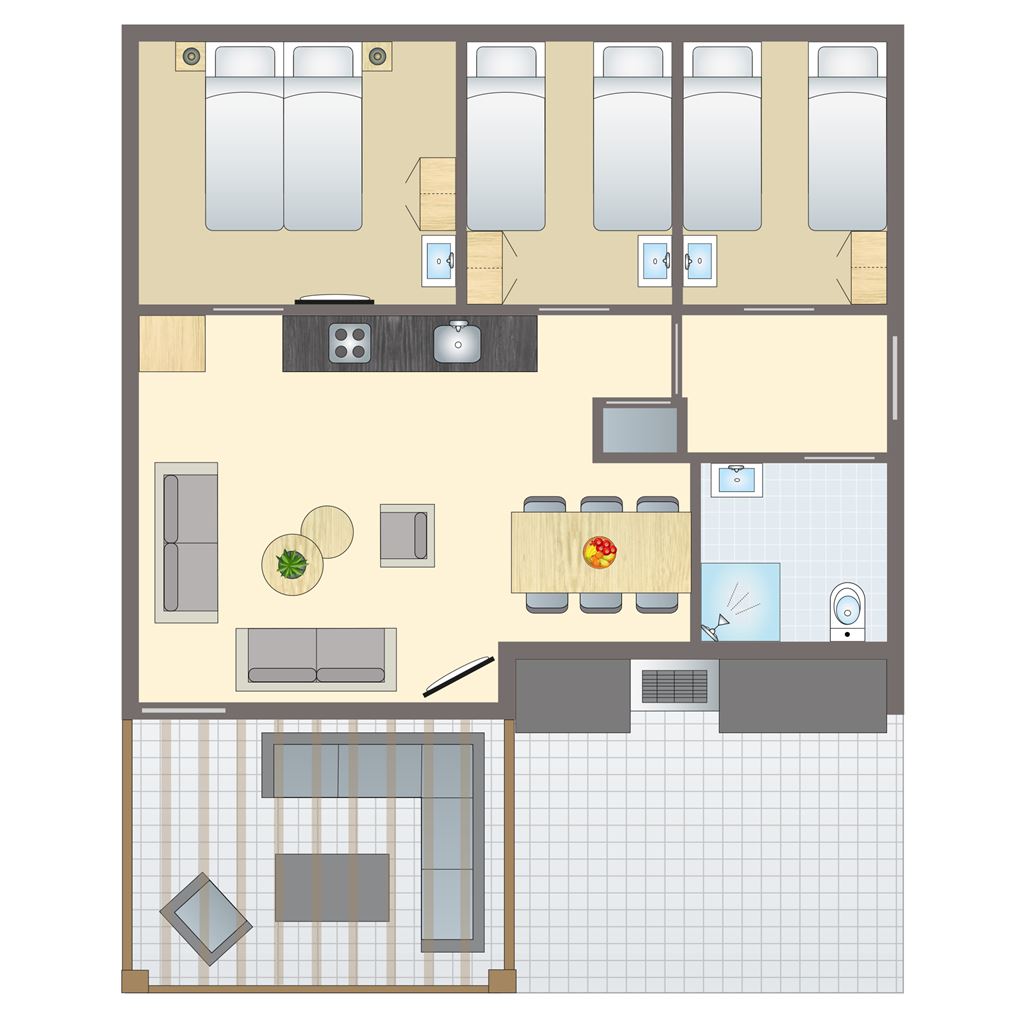 - Slaapkamer met twee 1-persoonsbedden, twee-persoonssofttopper, wastafel en flatscreen-tv