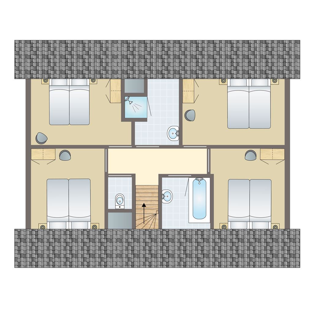 - Quatre chambres à coucher avec deux lits boxspring pour 1 personne au premier étage