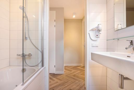 - Badkamer met douche in ligbad en wastafel op de eerste verdieping