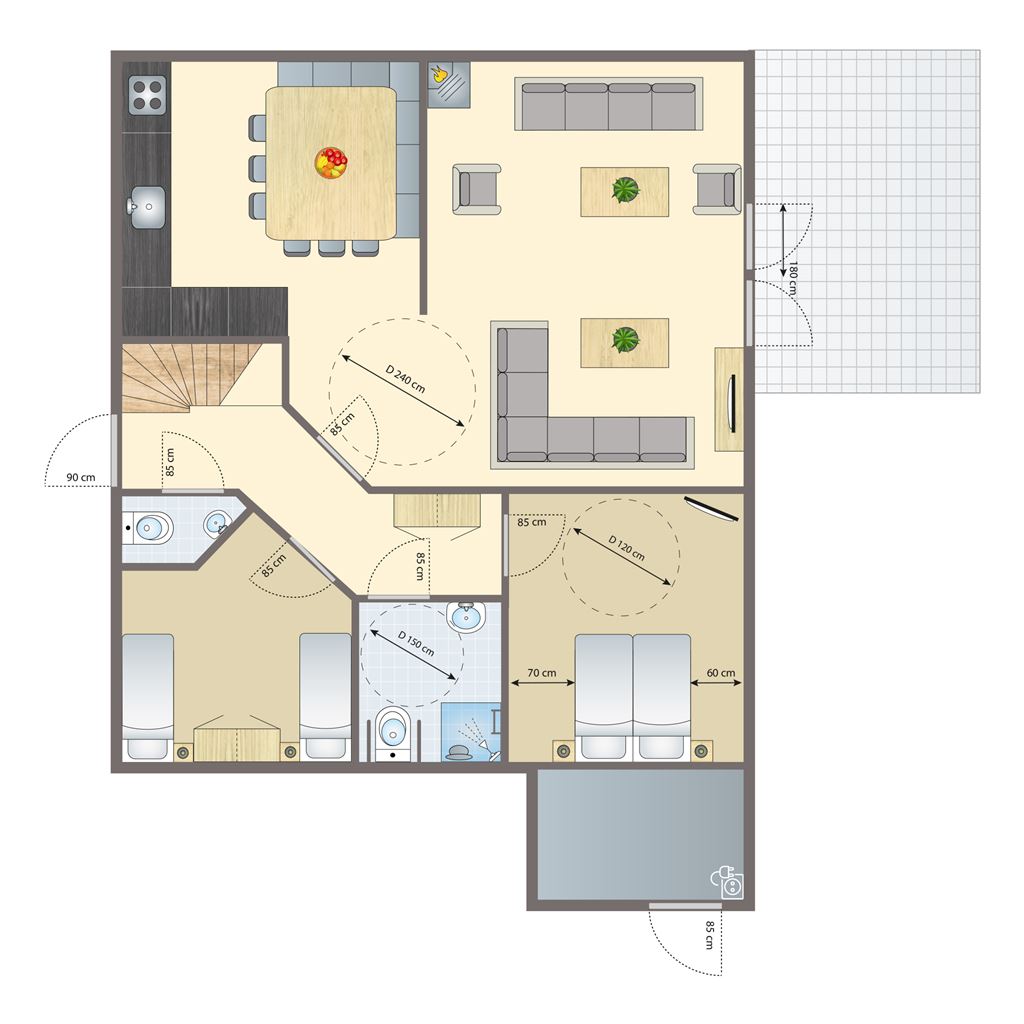 - Vanwege de maximale deurbreedte van 75cm is deze bungalow alleen toegankelijk voor kleine rolstoelen