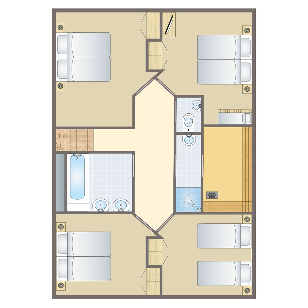- Slaapkamer met twee 1-persoons Auping boxsprings, softtopper, ruimte om hoog-/laagbed te plaatsen, ruimte naast kant van het bed minimaal 90 cm en draaicirkel minimaal 140 cm