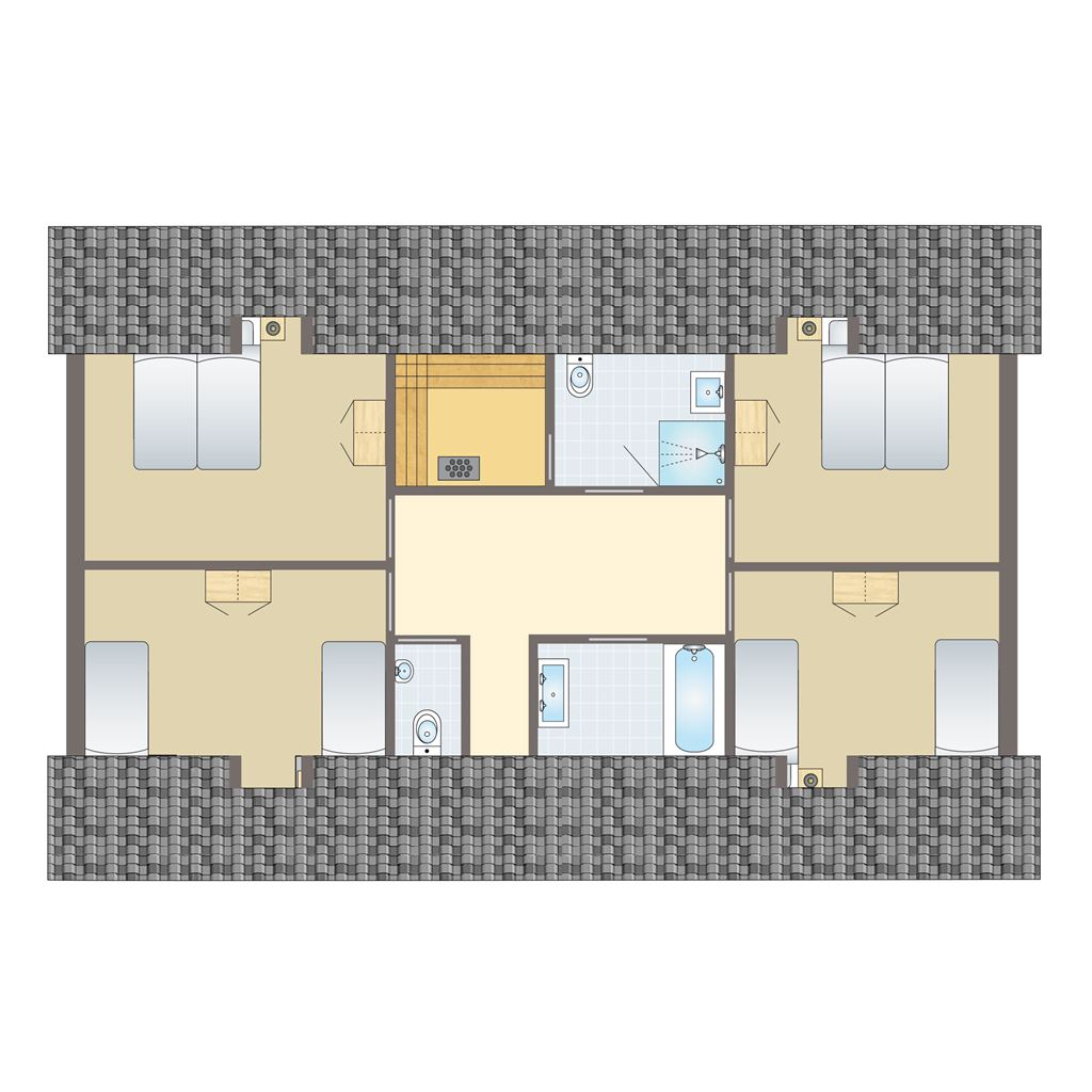 - Drie slaapkamers met twee 1-persoons boxsprings op de eerste verdieping
