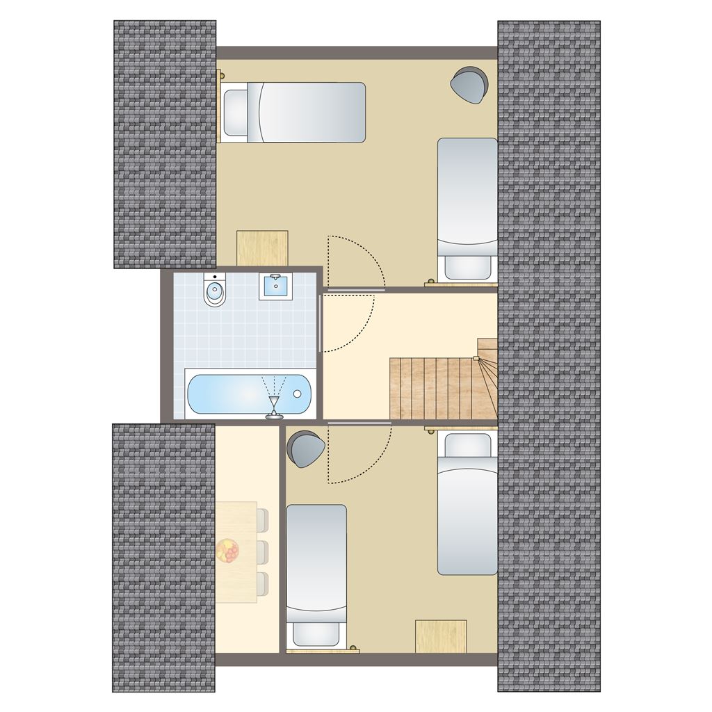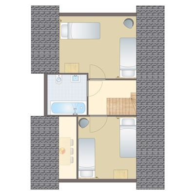 - Kinderslaapkamer met twee 1-persoonsbedden, twee zitzakken, speelkleed, commode met aankleedkussen en frans balkon op de eerste verdieping