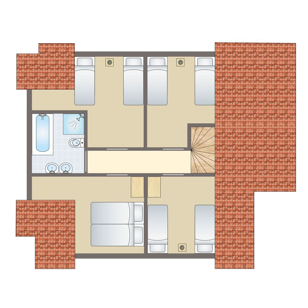 - Vier slaapkamers met twee 1-persoons boxsprings op de eerste verdieping