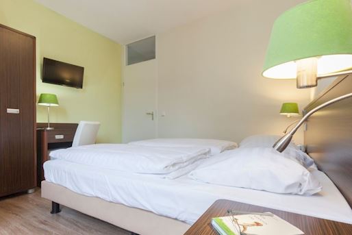 - Slaapkamer met twee 1-persoons boxsprings en flatscreen-tv