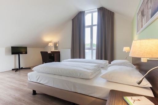 - Slaapkamer met twee 1-persoons boxsprings en flatscreen-tv