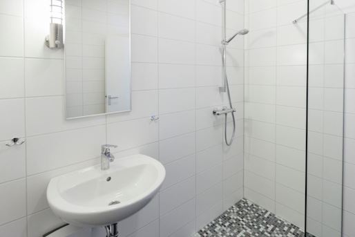 - Badkamer met douchecabine, wastafel en toilet