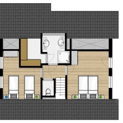 - Drie slaapkamers met twee 1-persoons boxsprings