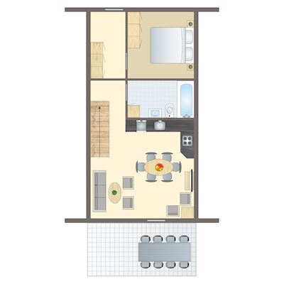 Dit type vakantiehuis is ingericht met verschillende interieurs en vloeren. De gezellige inrichting verschilt daarom van huis tot huis. Het vakantiehuis heeft een beschut terras op het zuiden waar je in alle rust kunt genieten. Het vakantiehuis is verdeeld over twee verdiepingen en heeft drie slaapkamers. De gecombineerde woonkamer en keuken creëren een geschikte setting voor familiebijeenkomsten. De vakantiehuizen zijn privébezit, daarom zijn beschrijvingen, foto's, specificaties en plattegronden van de vakantiehuizen indicatief en kunnen ze afwijken.