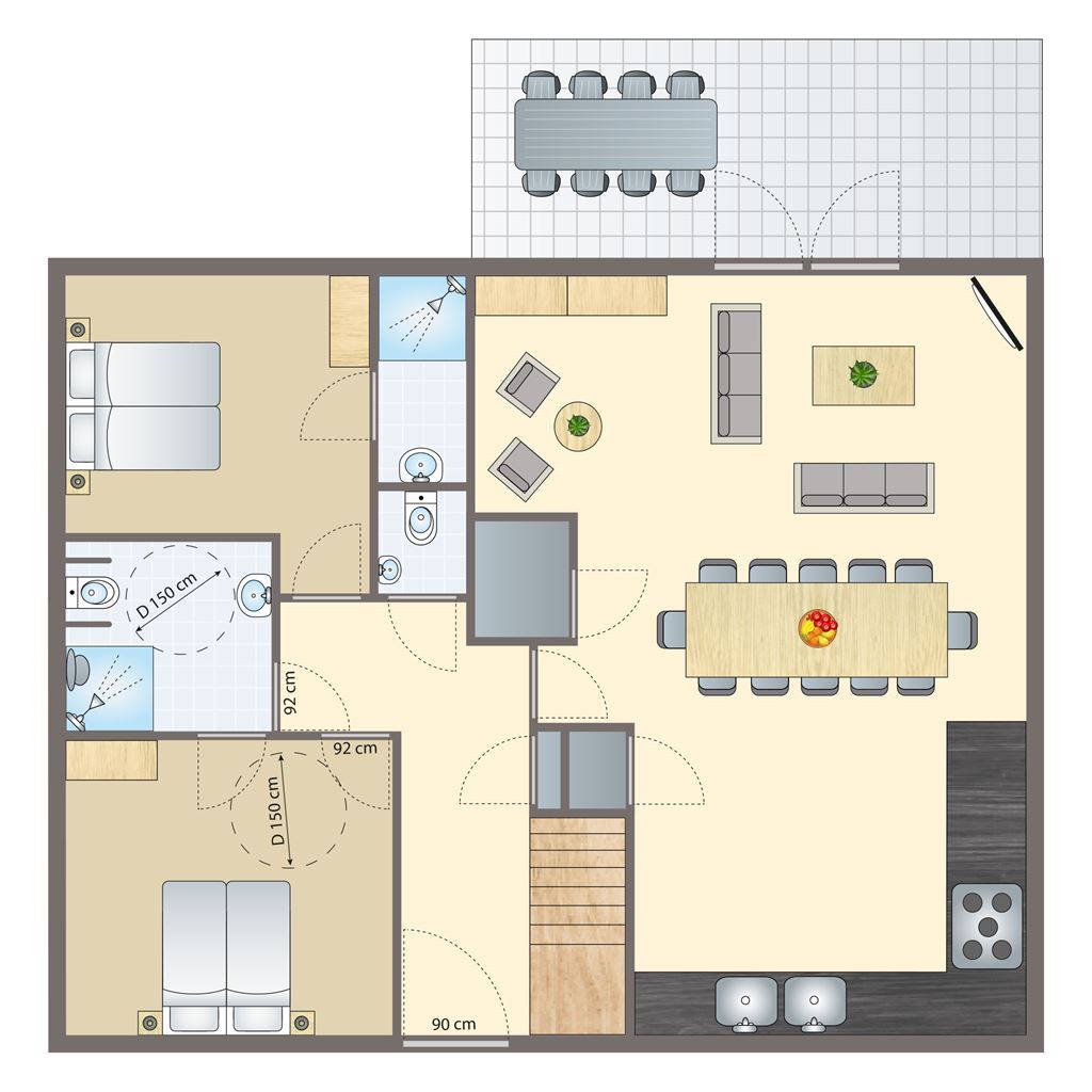 - Aangepaste badkamer met vlakke douche, vast douchezitje met armleuningen, handgrepen in douchegedeelte, wastafel minimaal 78 cm hoog en onderrijdbaar, verstelbare spiegel, verhoogd toilet met beugels en draaicirkel minimaal 150 cm