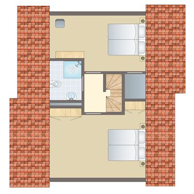 - Twee slaapkamers met twee 1-persoons boxsprings op de eerste verdieping