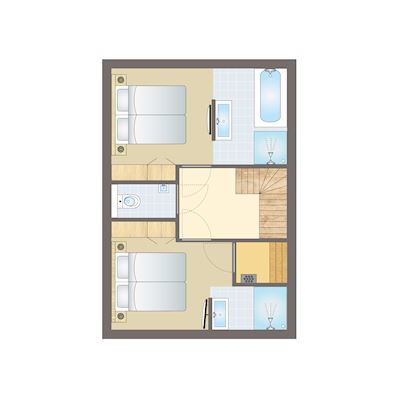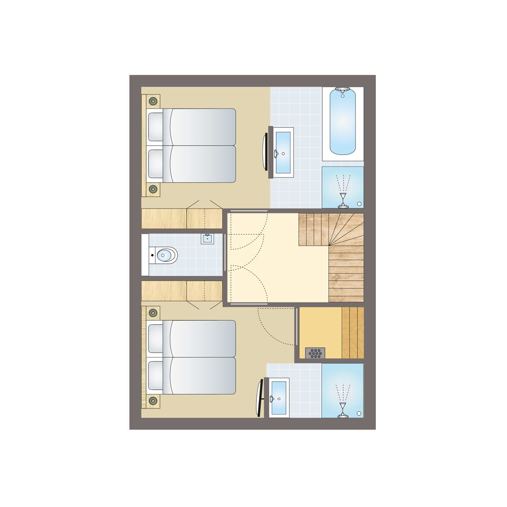 - Twee slaapkamers met twee 1-persoons boxsprings en tv op de eerste verdieping