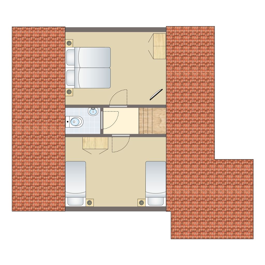 - Twee slaapkamers met twee 1-persoons boxsprings op de eerste verdieping