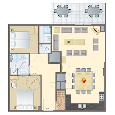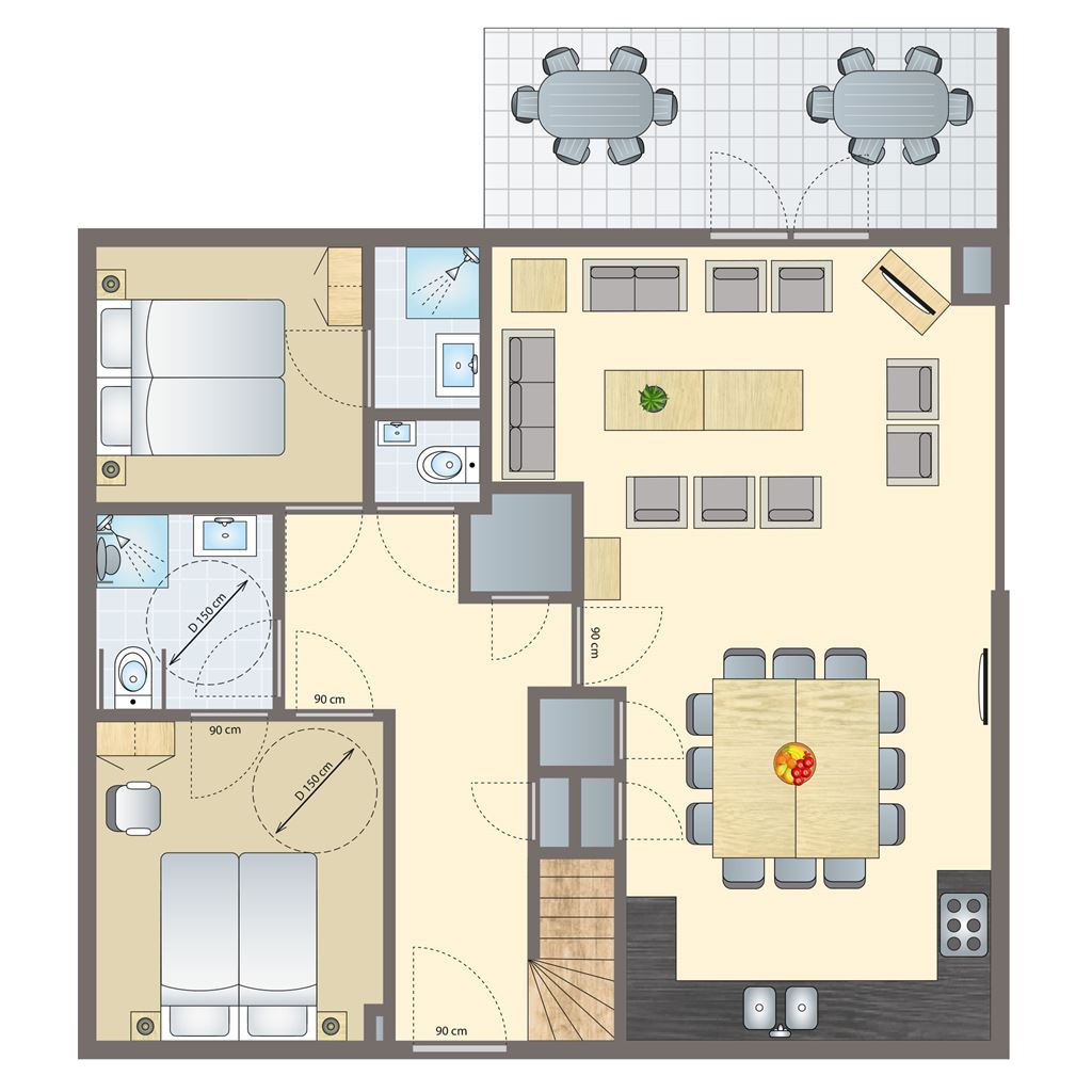 - Aangepaste slaapkamer met twee 1-persoons boxsprings met ruimte om een hoog/laagbed te plaatsen, ruimte naast één kant van het bed minimaal 90 cm en een draaicirkel minimaal 150 cm