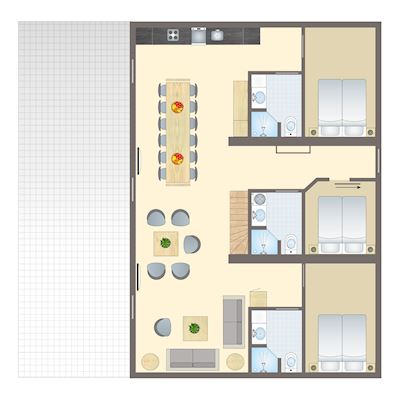 Het vakantiehuis heeft twee verdiepingen, een keuken met twee koelkasten met vriesvak en een open verbinding naar de grote woonkamer. Vanuit de woonkamer is er toegang tot een privéterras. De vakantiehuizen zijn privébezit, daarom zijn beschrijvingen, foto's, specificaties en plattegronden van de vakantiehuizen indicatief en kunnen ze afwijken.