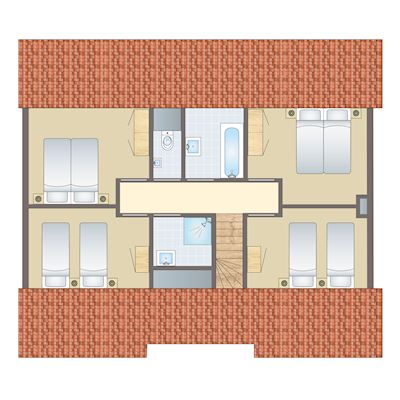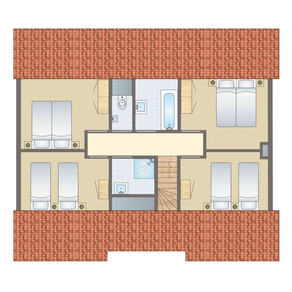 - Drie slaapkamers met twee 1-persoons boxsprings op de eerste verdieping