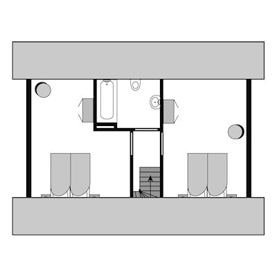 - Twee slaapkamers met twee 1-persoons boxsprings op de eerste verdieping