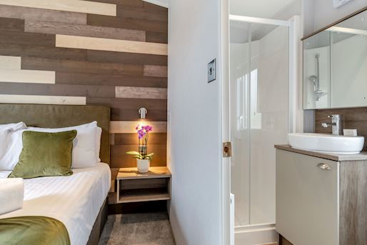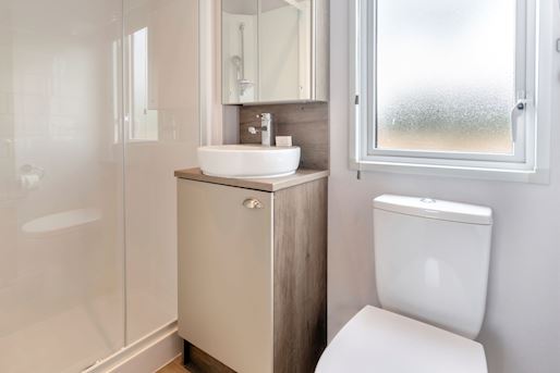 - Badkamer en suite met douchecabine, wastafel en toilet