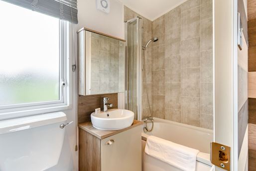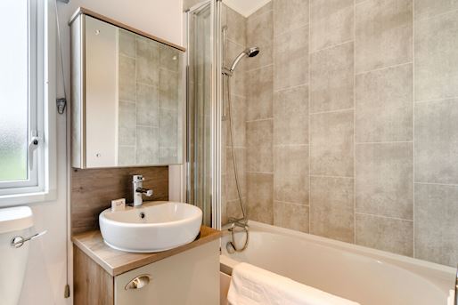 - Badkamer en suite met douche in ligbad, wastafel en toilet